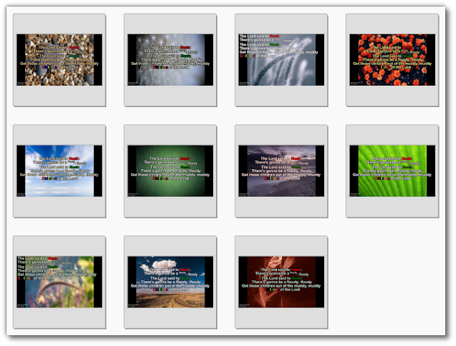 Usé el programa XnViewMP (es multiplataforma) para redimensionar (tiene un convertidor masivo) cada imagen al estandar que usa OpenLP: 1024x768. Después en OpenLP con cada imagen creé un nuevo tema (usted también puede crear los suyos propios)Para la combinación de colores me ayudé con el programa Gpick tomando el color de cada wallpaper y generando su complementario o triada u otro para saber qué color de letra podría poner con respecto al fondo (Nota: en Gpick usé Color Whell: RYB v1). También explico que dependiendo de la imagen usada puse las letras arriba o en medio o abajo. Además usé el tamaño de letra 42, con negrita, y bordes en todas.